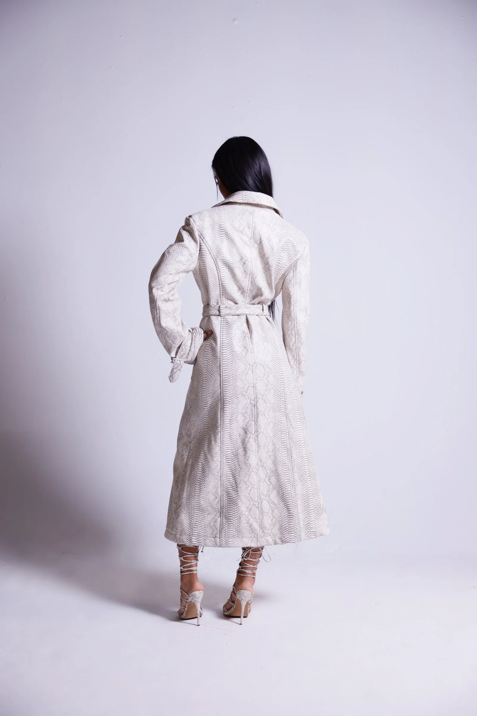 A sharp silhouette in soft faux python printed leather. Clean lines, strong shoulders, fully lined and a waist belt that pulls everything together. Heavy. Wear it open, closed, or barely belted.