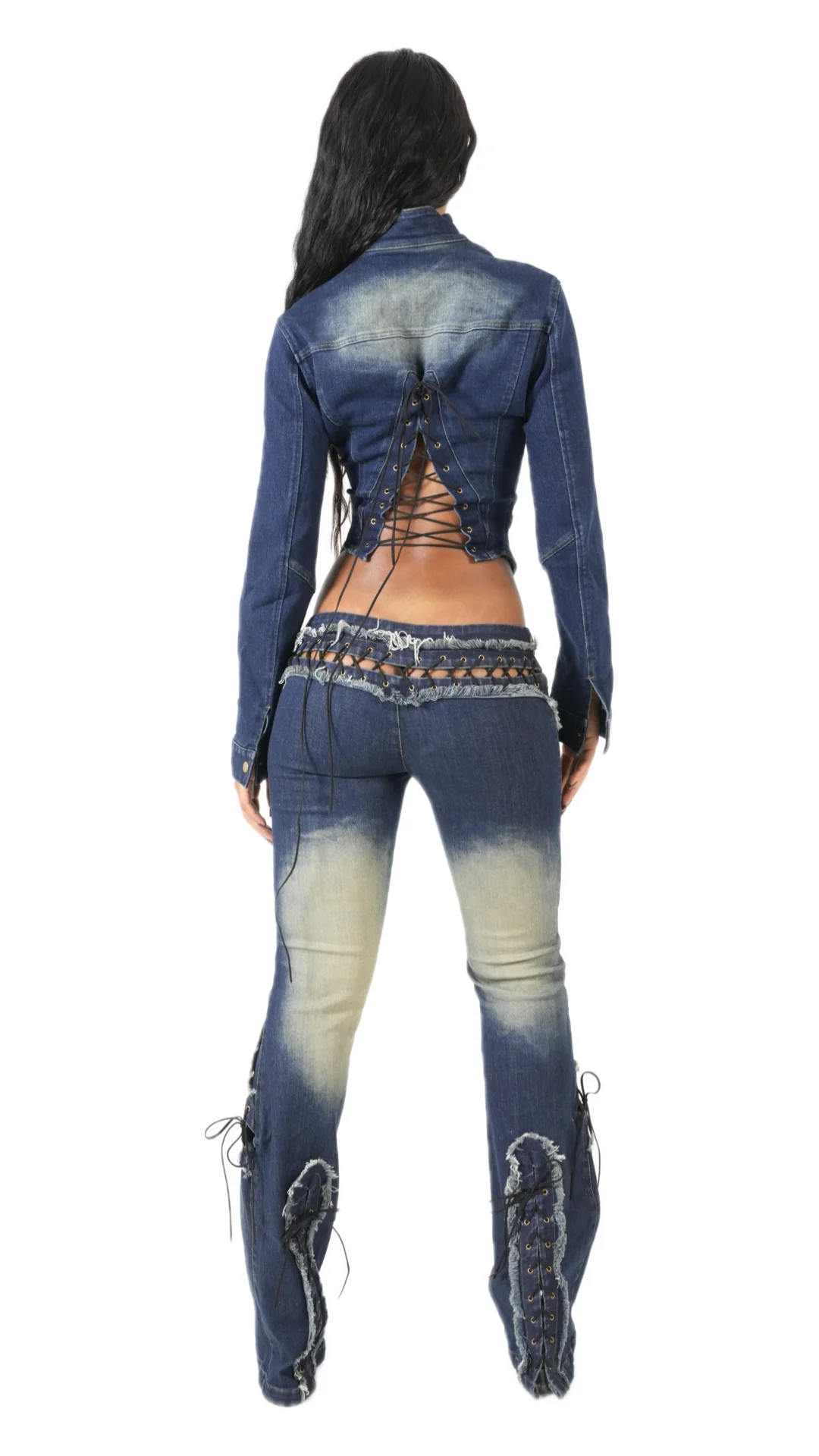 A FIGURE HUGGING SOFT AND STRETCHY DENIM MOTO JACKET. LACED BACK FOR PERFECT FIT.